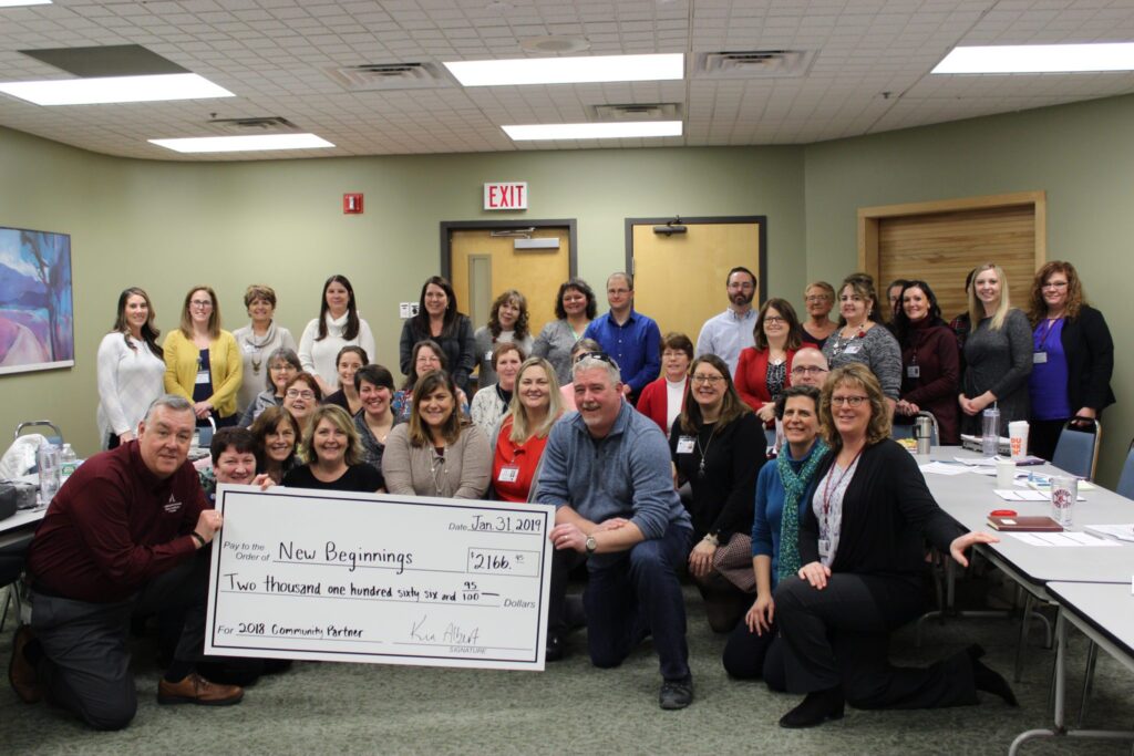 LEWISTON – – Androscoggin Home Healthcare and Hospice present New Beginnings, their 2018 Community Partner, with a check for $2,166. New Beginnings, based out of Lewiston, supports runaway and homeless youth and their families. Androscoggin Home Healthcare and Hospice, also a non-profit organization, selects another local non-profit to be the beneficiary of their Community Partnership.